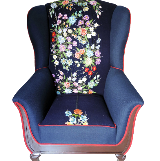 A throne for a king or queen! Elegant individual sofa with cherry base in deep midnight blue with flower embroidery from Chiapas. Posh and comfortable at the same time, this piece will make you feel on top of the world.