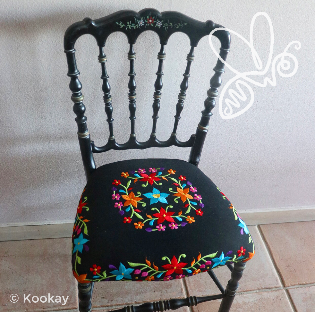 Little black chair with bright flower embroidery from Chiapas. Antique French mahogany chair hand painted in black. A little detail that will lighten up a small corner, an entrance or small room. Elegant and cheerful.