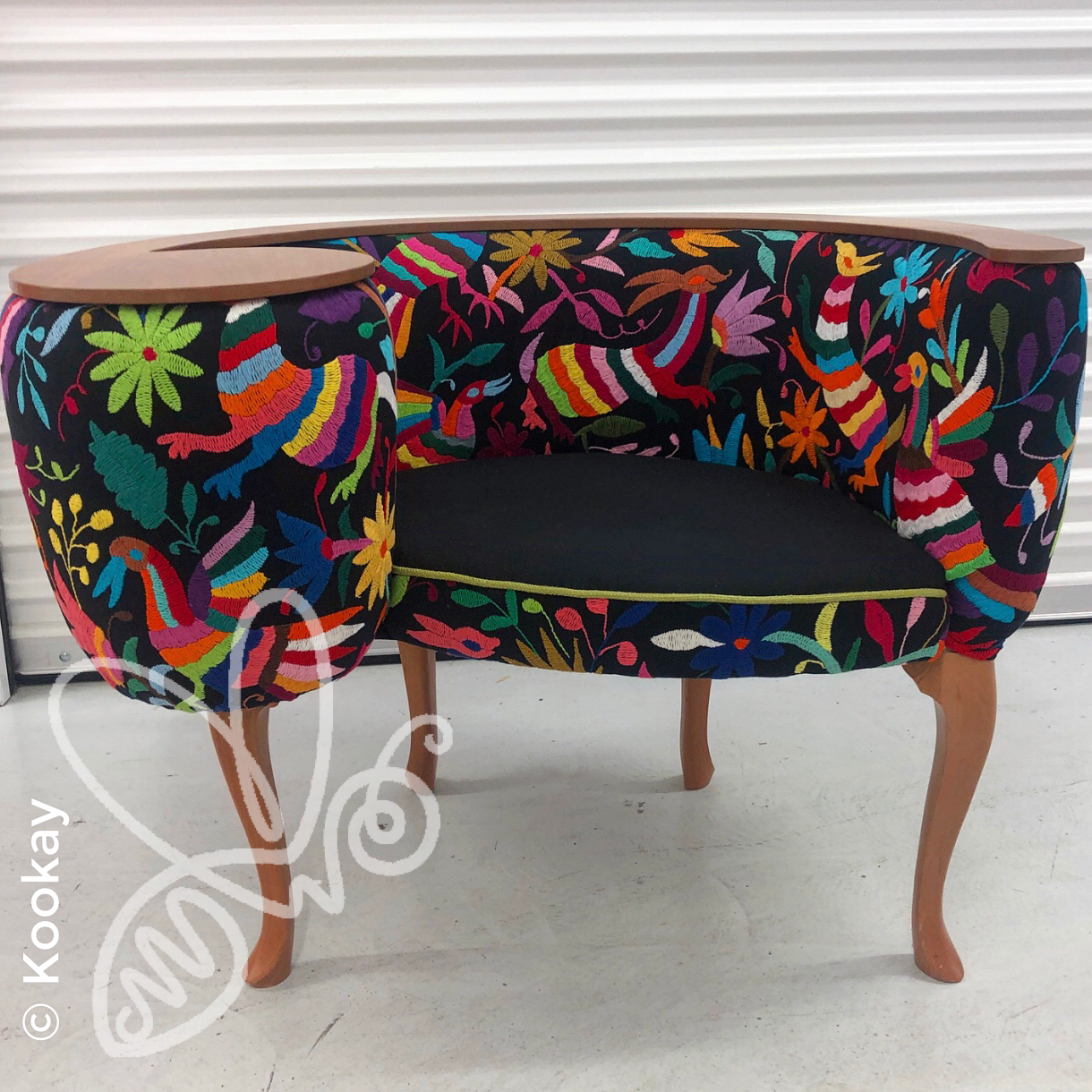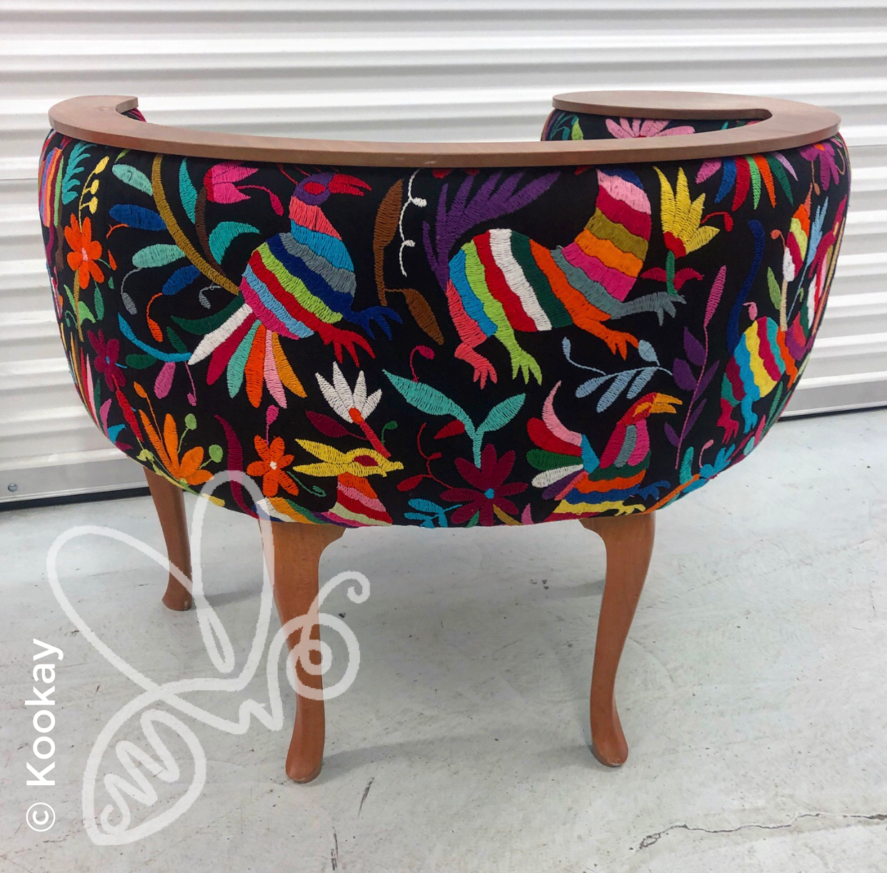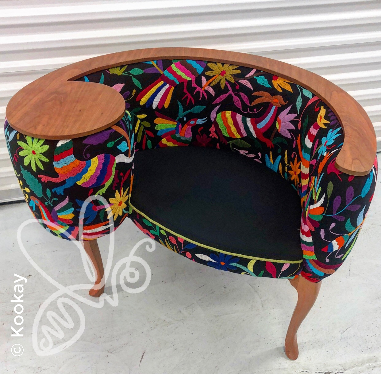Unique infinity chair made in cherry with colorful animal and flower embroidery in black from Tenango de Doria. This black foreground is hard to find as it takes longer to embroider due to the toll it takes on the eyesight of the embroiderer. This a unique, colorful space that will embrace you and transport you to mythical places, surrounded by exotic beasts and delicate flowers.