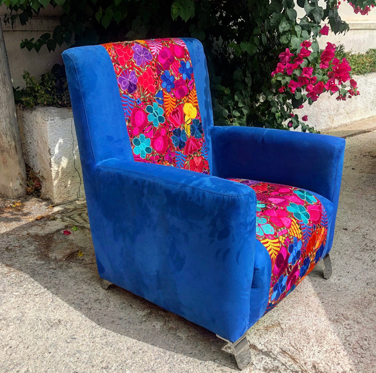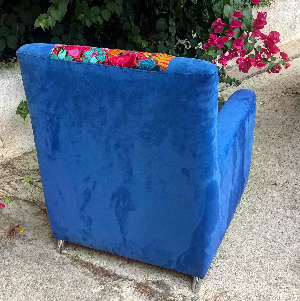 Elegant deep blue velvet sofa with colorful flower embroidery from Chiapas. This is the most comfortable sofa you will ever own Solid seating, the right size and lighter than you think. Bright blue so you will never be blue!