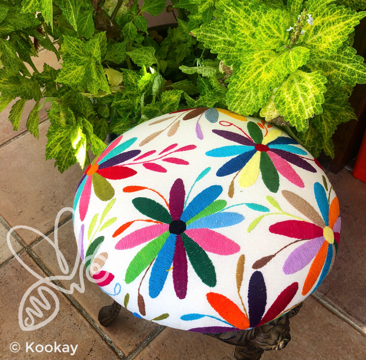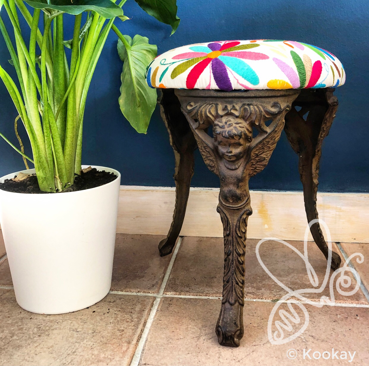 Iron-casted base reminiscent of Renaissance cherubs, with Tenango de Doria flowers. This stool, although small, brings light and happiness to any corner. Its sturdy, but light and easy to the sight. Will keep you company and bring good energy to your home.
