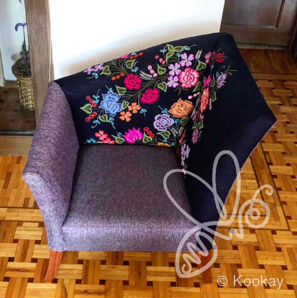Asymmetrical lounge chair for one with flower embroidery from Chiapas. This beauty will stop and make you look twice… or thrice! Elegant, modern and very comfortable, this chair will make you want to grab a seat.