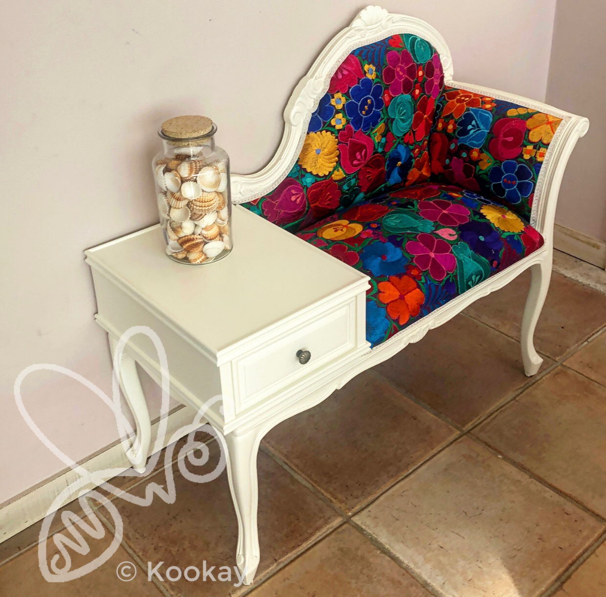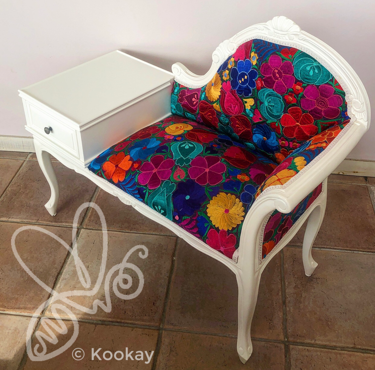Classic telephone table with drawer in white with bright flower upholstery from San Cristobal de las Casas, Chiapas. Long and meaningful phone conversations are back!